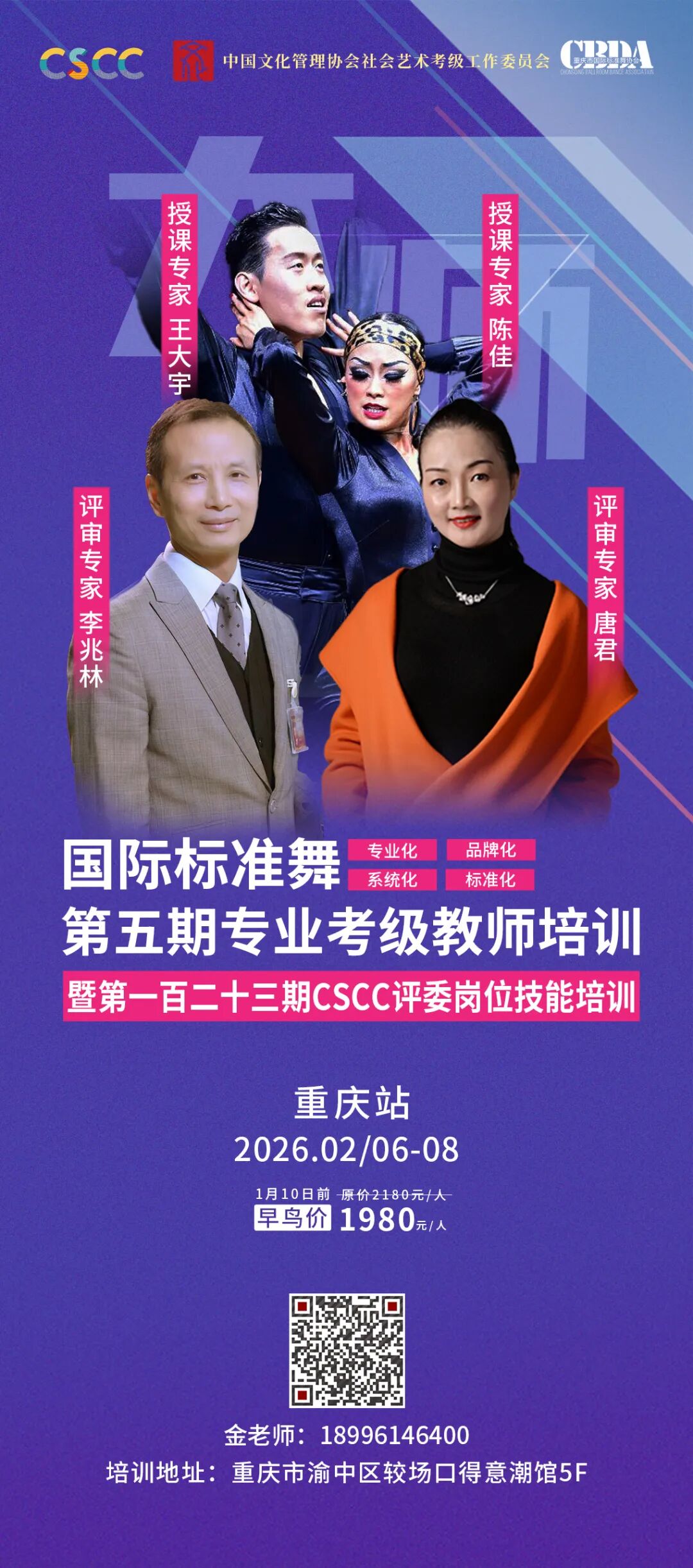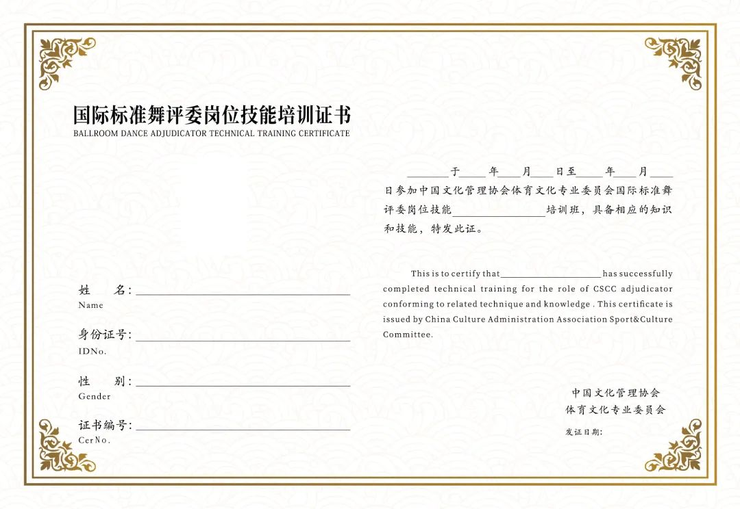 为加强社会艺术水平考级国际标准舞专业教师的学习,同时全面提升我国国际标准舞评委专业素养和专业技能,由中国文化管理协会社会艺术考级工作委员会主办的专业考级教师培训班、CSCC中国文化管理协会体育文化专业委员会主办的国际标准舞评委岗位技能培训班,将在2026年2月6日至8日在中国·重庆举办。